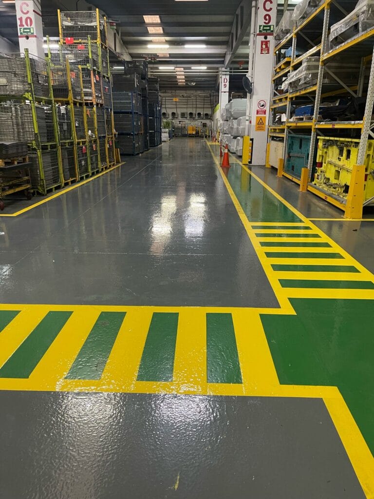 Endüstriyel Alanlar: Fabrika ve depo yollarında güvenli trafik yönlendirmesi için epoksi yol çizgileri ve işaretlemeleri yapılır.